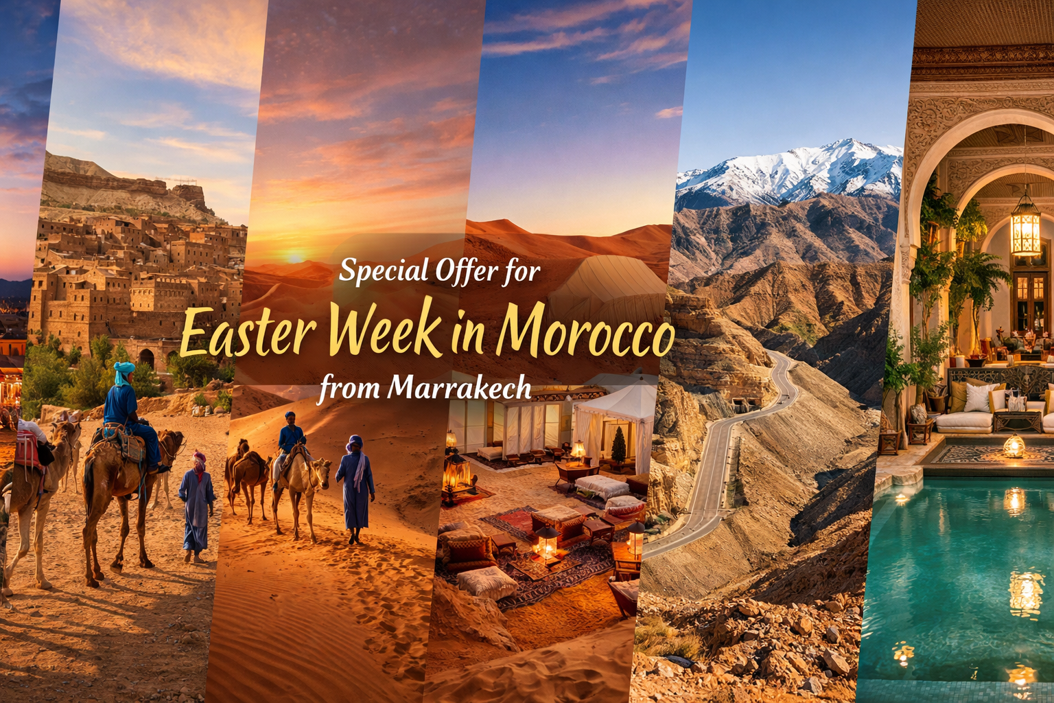 One of the highlights of Easter Week in Morocco is the opportunity to experience the Sahara. Morocco desert tours from Marrakech offer camel treks, luxury camps, and unforgettable sunsets over golden dunes.